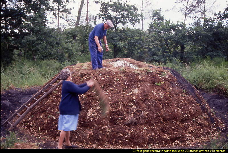 Toute la meule est ainsi couverte, à l’exception d’un espace d’une quinzaine de cm de diamètre en son sommet. Tout le temps que durera la cuisson, le charbonnier aura bien soin de colmater toute brèche qui se constituerait dans cette couverture.