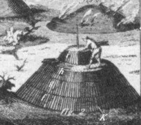 Notons encore que les bûches constituant la base sont celles qui ont la plus petite circonférence, les plus grosses étant réservées aux étages supérieurs (ceci, afin que le feu qui partira du centre de la base soit de suite en contact avec du bois facilement inflammable).