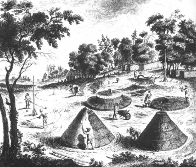Cette technique consistait à embraser le bois entassé en meules, puis à étouffer le feu en empêchant la pénétration de l’air et à laisser ainsi se consumer le bois pour que l’action du feu pénètre jusqu’en son coeur de façon à réduire le bois en charbon.