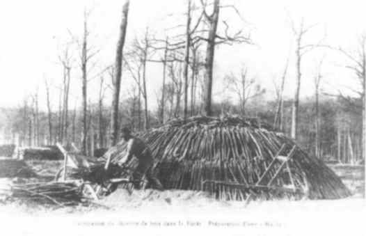 De préférence, on utilisait des taillis de 18 à 20 ans qui fournissaient des rondins de 6 à 12 pouces de circonférence (17,5 à 35 cm). Les bûches trop grosses sont fendues et réduites en « cotrets ». Les branchages avaient le tort d’être presque toujours tordus, ce qui occasionnait des vides à l’intérieur de la meule.