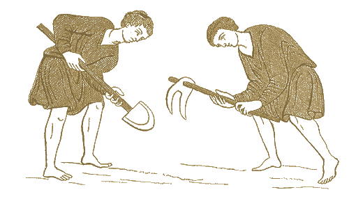 Laboureurs du XIIème siècle - d'après une miniature figurant sur le manuscrit de la Sainte-Chapelle (Bibliothèque Nationale)