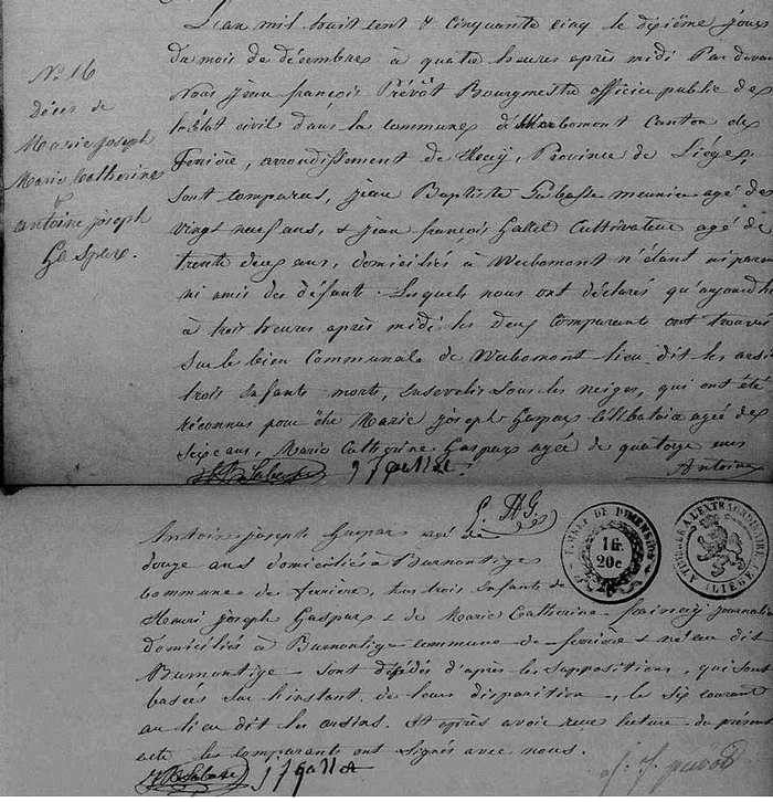En cette veille de Pâques 2018, je viens de découvrir dans les archives de Werbomont, l'acte de décès de ces trois enfants découverts morts, ensevelis sous la neige. C'était le 10 décembre 1855 à 4 heures de l'après-midi et ils étaient disparus depuis le 6 décembre. Mais ils ignoraient probalement que c'était le jour de la fête des enfants ..... (voir acte ci-dessous)