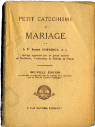 fins du mariage ? » demande un catéchisme de 1782. Et les choses évoluèrent fort lentement. C'est ainsi que dans le "Petit Catéchisme du mariage" imprimé le 27 mars 1920 à Paris, on y retrouve encore les préceptes suivants (extraits) : D'où vient